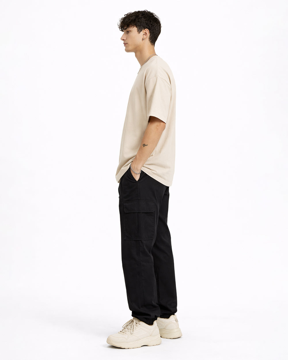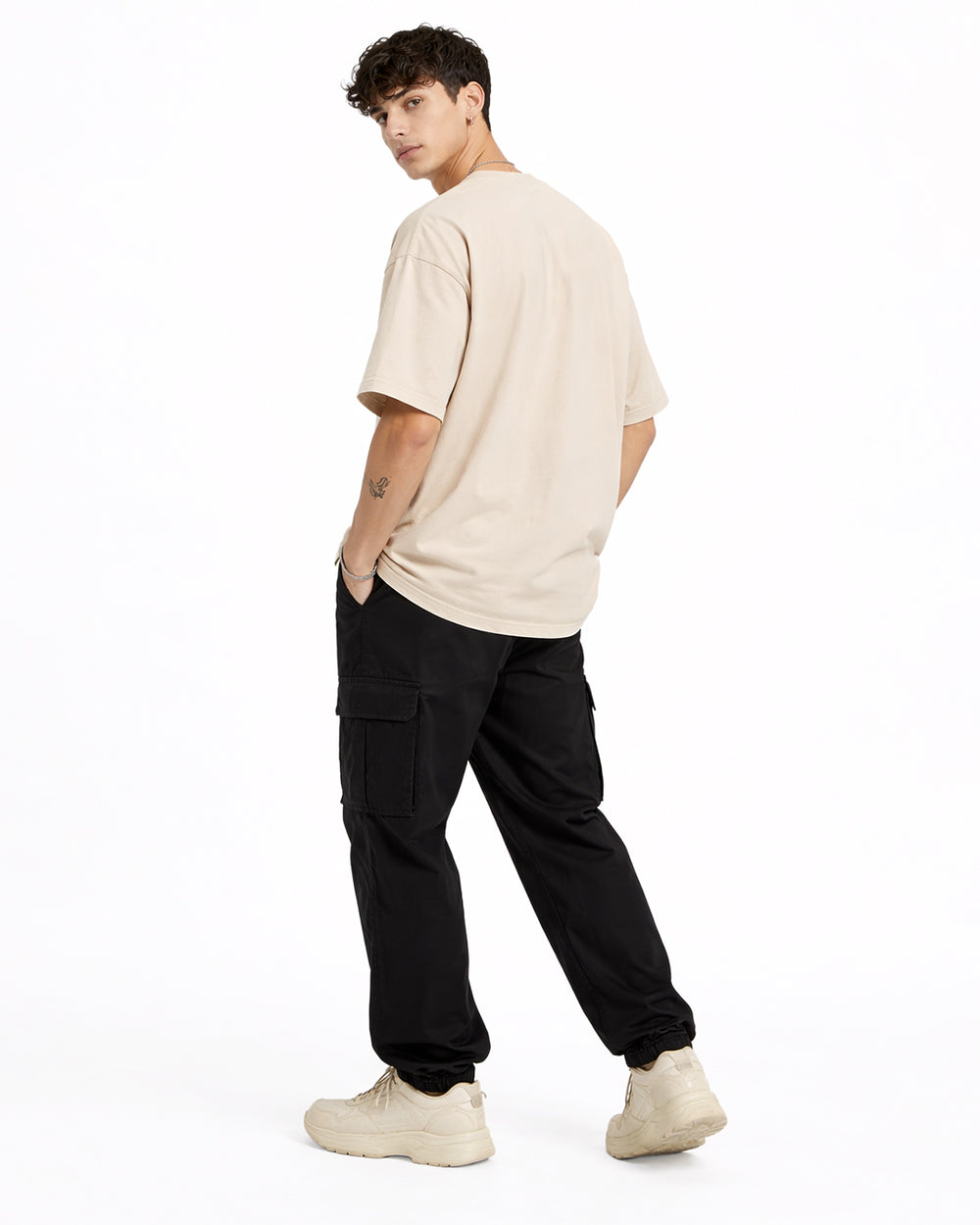 effortless street styling. The beige base creates contrast against the bold black graphic, giving