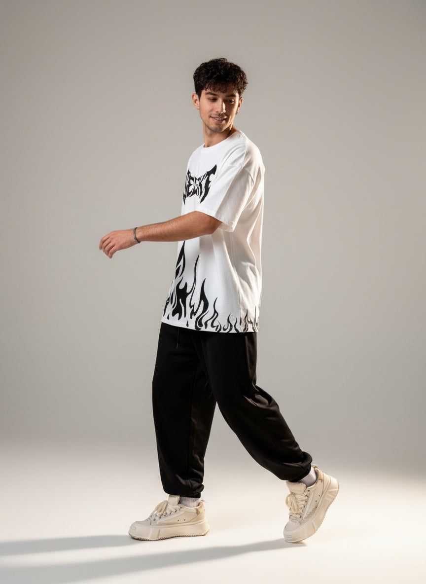 streetwear movements, the flame artwork represents energy, rebellion, and